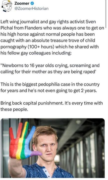 Jurnalistul de stânga și activistul pentru sodomiți Sven Pichal din Flandra, care a fost întotdeauna un moralist împotriva oamenilor normali, a fost prins cu peste 100 de ore de pornografie infantilă, pe care a împărtășit-o cu colegii săi poponari, inclusiv: