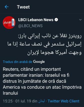 2. Basescu era azi la radio si dadea tare ca “UE trebuie sa inteleaga ca Iranul e dusman pentru ea, nu partener, si oy vey, Romania trebuie sa se ralieze punctului de vedere american”. Sper ca sunteti gata sa muriti pentru Israel, da? https://www.haaretz.com/misc/article-print-page/.premium-netanyahu-s-iran-dilemma-how-to-get-trump-to-act-without-being-on-front-line-1.7269100 Dilema lui Netanyahu privind Iranul: cum sa-l faca pe Trump să acționeze fără să pună Israelul în prima linie Mai 2019