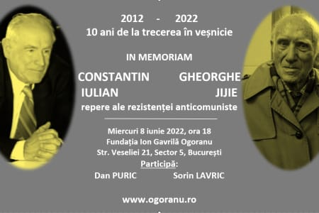 Eveniment memorial la București: Constantin Iulian și Gheorghe Jijie. 10 ani de la trecerea în veșnicie Seară dedicată împlinirii a 10 ani de la trecerea în veșnicie a doi mari luptători anticomuniști: Constantin Iulian și Gheorghe Jijie