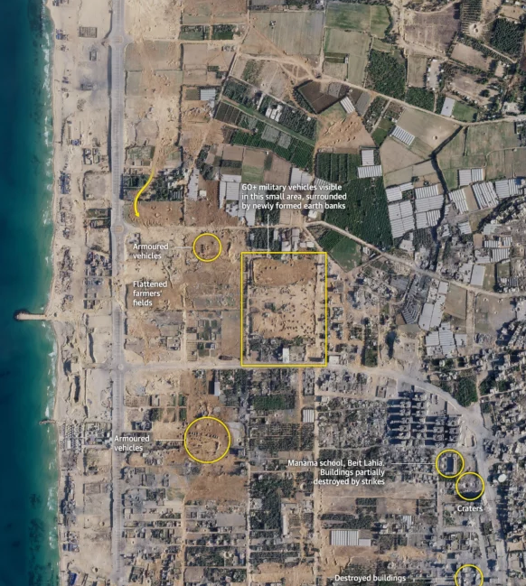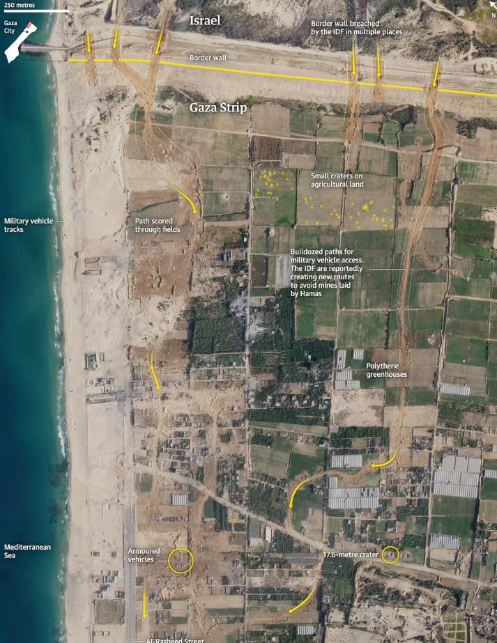 O analiză efectuată de Guardian a imaginilor din satelit din nordul Fâșiei Gaza în urma bombardamentelor intense a identificat peste 1.000 de cratere vizibile din spațiu pe o suprafață de aproximativ 10 kilometri pătrați.