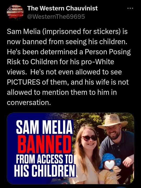 Lui Sam Melia (întemnițat pentru abțibilde anti-imigrație) i s-a interzis să-și vadă copiii. A fost catalogat drept o persoană de risc pentru copii pentru convingerile sale pro-albe. Nici măcar nu i se permite să vadă POZE cu copiii lui, iar nevestei sale i se interzice să țină legătura cu el.