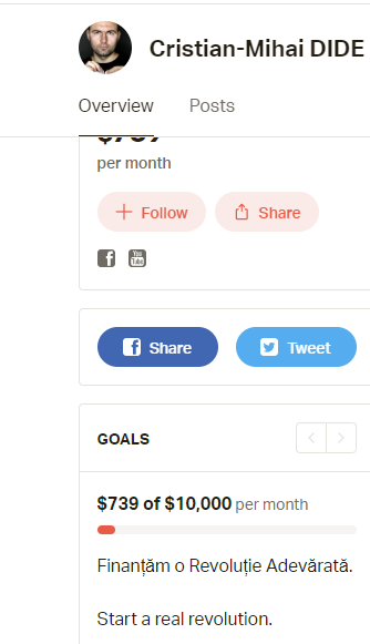 „Ajutați-mă să creștem suma pe Patreon. Am nevoie de ajutorul vostru. Nu vă opriți să ne susțineți financiar. Cu cât mai repede ajung la 10.000 Euro lunar cu atât voi putea să fac mai multe:
