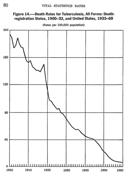 Incidența tuberculozei (TBC) a scăzut, de asemenea, pe măsură ce au fost inițiate îmbunătățiri în locuințe, reducerea aglomerării și programele de control al TBC. În 1900, 194 din 100.000 de rezidenți americani au murit din cauza tuberculozei – a doua cauză principală de deces – și majoritatea erau rezidenți ai zonelor urbane. În 1940 (înainte de introducerea terapiei cu antibiotice), TBC a rămas principala cauză de deces, dar rata brută a mortalității scăzuse la 46 la 100.000 de persoane. Nu a existat niciodată un vaccin împotriva tuberculozei în Statele Unite. Cu toate acestea, ratele de TBC din alte țări au scăzut și înainte de introducerea vaccinului împotriva TBC.