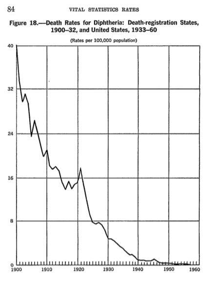 În Statele Unite (și alte țări), înregistrările istorice arată că mortalitatea prin boală a scăzut cu aproape 90% înainte de introducerea programelor de vaccinare de rutină – așa cum se menționează în raportul Trends in the Health of Americans : http://pediatrics.aappublications.org/content/106/6/1307