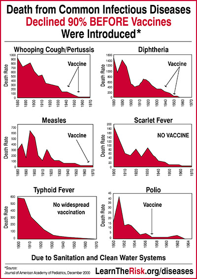 De fapt, unele dintre cele mai răspândite boli la începutul anilor 1900 – inclusiv tuberculoza (TBC), scarlatina și tifoida – au urmat aceleași scăderi FĂRĂ a avea vreodată un program de vaccinare (în SUA). Aceste boli au fost aproape eradicate în SUA fără ca populația să fie vaccinată pentru ele. (Vezi graficele):