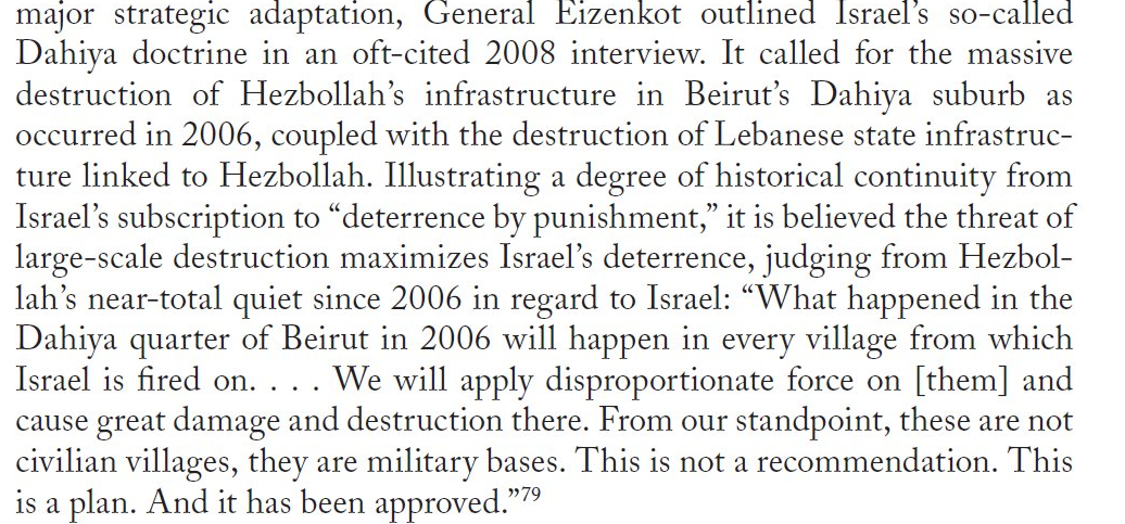 În 2008, generalul Eizenkot a prezentat ceea ce a numit “doctrina Dahyeh” ca fiind un grad extrem de “descurajare prin pedeapsă”. El a avertizat că distrugerea pe scară largă de către IDF a bunurilor destinate exclusiv civililor și teroarea provocată în 2006 unui milion de locuitori din suburbia Dahyeh din Beirut va fi reînnoită.