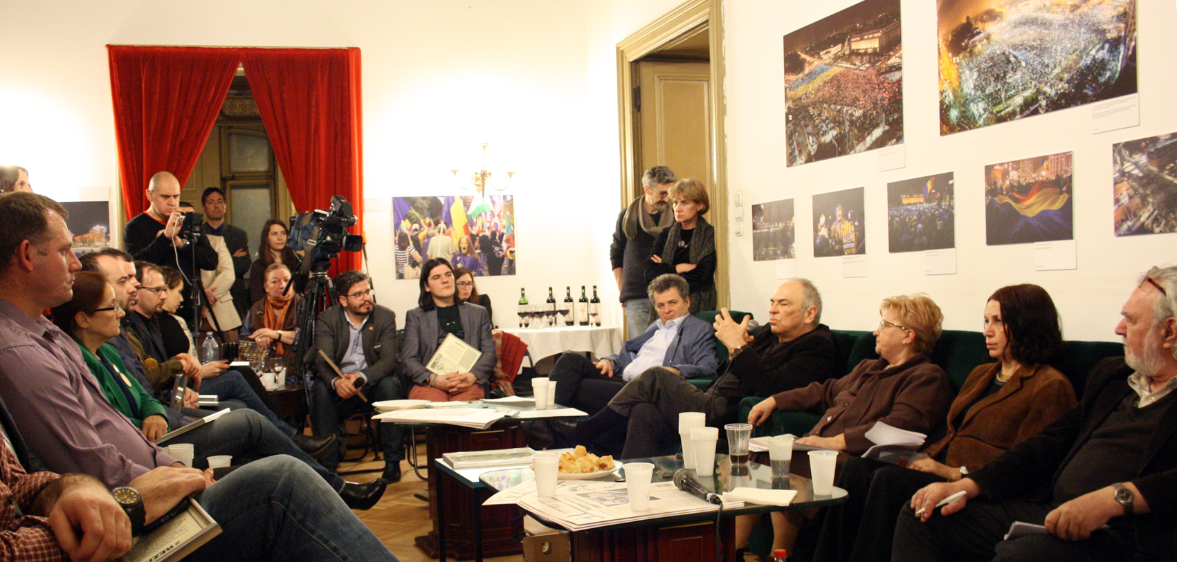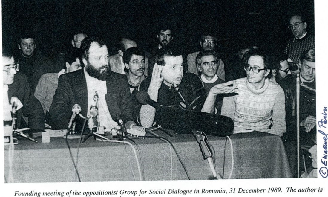 Grupul Pentru Dialog SocialConferința de lansare a GDS, pe 31 decembrie 1989, a fost susținută la Inter de Stelian Tănase, Mircea Dinescu și Gabriel Andreescu. Foto: Emanuel Parvu.