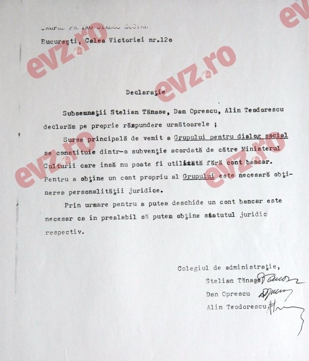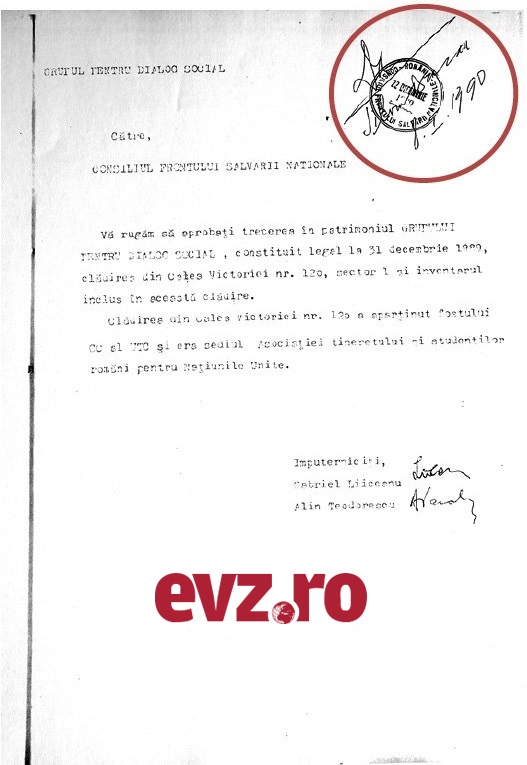 Reamintim pe scurt faptele, dovedite prin documente apărute în exclusivitate în EvZ: La data de 8 ianuarie 1990, Silviu Brucan, fondator al Grupului pentru Dialog Social, în calitate de reprezentant al Consiliului Frontului Salvării Naționale le aprobă colegilor săi de Grup, Gabriel Liiceanu și Alin Teodorescu, sediul impozant din Calea Victoriei 120, care aparținuse UTC (pentru Nicu Ceaușescu) și care fusese trecut în acte în administrarea Minsterului Culturii, respectiv a Muzeului Național al Satului „Dimitrie Gusti”. La data respectivă organizația nu era constituită legal. Cei doi au preluat patrimoniul de lux al UTC transferat Ministerului Culturii fără acoperirea legii. Înregistrarea ca persoană juridică a GDS a avut loc după 22 ianuarie 1990.