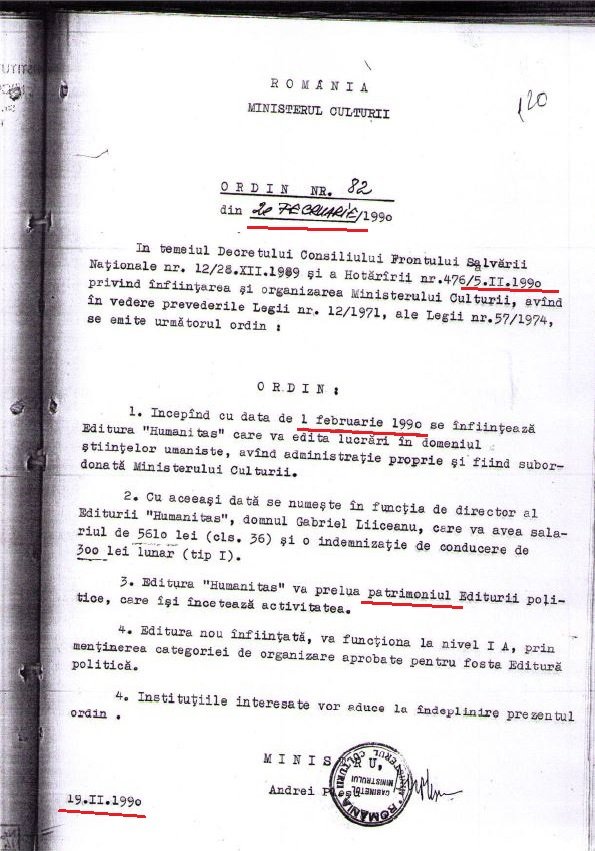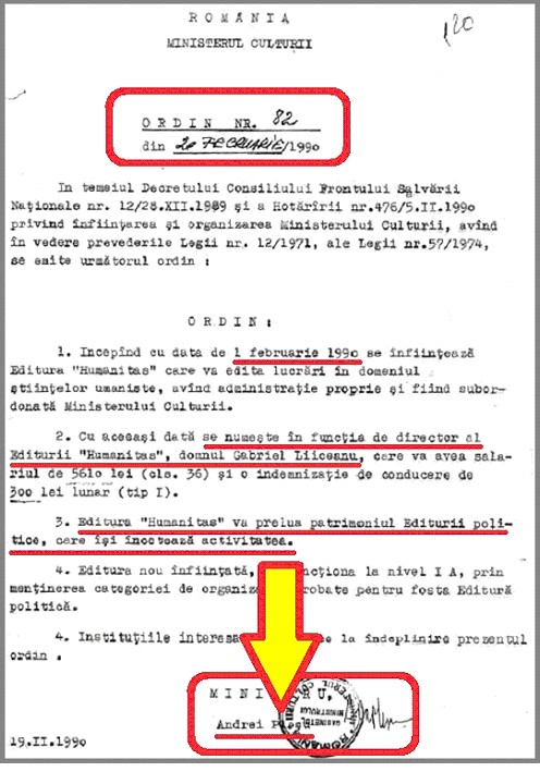 Dar, după cum stă scris în Ordinul care trebuia să rămână secret, adevărul „pe bază de documente” stă tocmai invers: începând cu data de 1 februarie se înființează Editura Humanitas și cu aceeași dată se numește în funcția de director Liiceanu, cu un salariu de 5610 lei și o indemnizație de conducere de 300 lei, ocazie cu care editura nou înființată preia patrimoniul Editurii politice (document mai jos).
