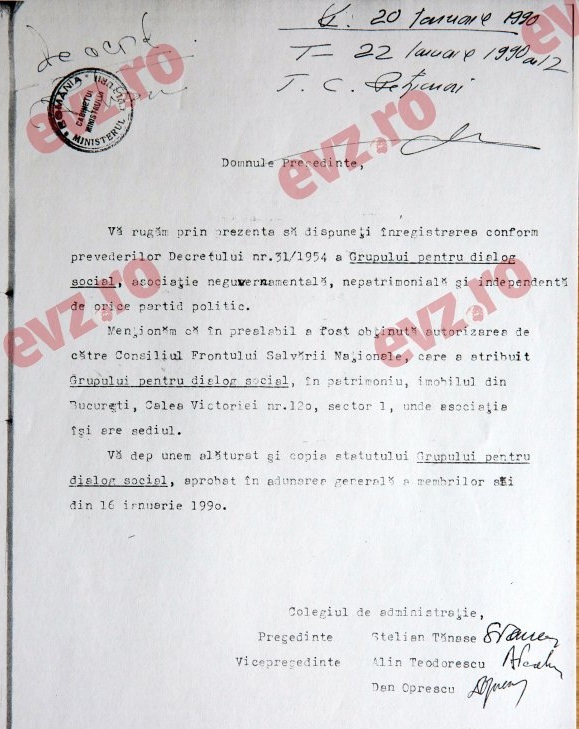 Aprobarea pentru înregistrare la Tribunal este dată de Andrei Pleșu, la rândul lui membru fondator al GDS, dar de data aceasta în calitate de Ministru al Culturii și, ca să ființeze mai bine, același ministru membru al GDS își acordă carevasăzică sieși și colegilor săi și o generoasă subvenție financiară. Documentele publicate în premieră vorbesc de la sine.