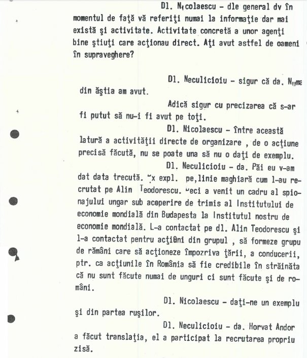 Sub prestare de jurământ, la data de 12 iunie 1994, ora 13.30, celebrul general de contraspionaj Victor Neculicioiu informează din nou, pentru a doua oară, membrii Comisiei senatoriale pentru cercetarea evenimentelor din 1989 că Alin Teodorescu a fost agent maghiar, documentat și prins în fapt, și că cel care a participat la recrutarea sa pentru serviciile ungare se numește Horváth Andor. Recrutarea s-a perfectat la Institutul de Economie Mondială Cine este Horváth Andor?
