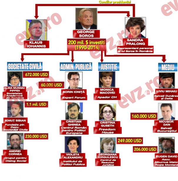 „Din 1990 și până acum, George Soros a dezvoltat o adevărată rețea de ONG-uri, cu care a acaparat noul concept de „societate civilă”, necunoscut românilor, astfel că a reușit să influențeze, în mod major, deciziile la nivel guvernamental. Pe lângă GDS și Fundația Soros, s-au dezvoltat o puzderie de ONG-uri legate de numele magnatului american.