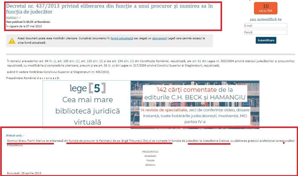 Link decret judecătorul Grecu, fost procuror Parchetul de pe lângă Tribunalul Dolj şi coleg la acea vreme în aceeaşi structură de parchet cu procuroarea Piţurcă