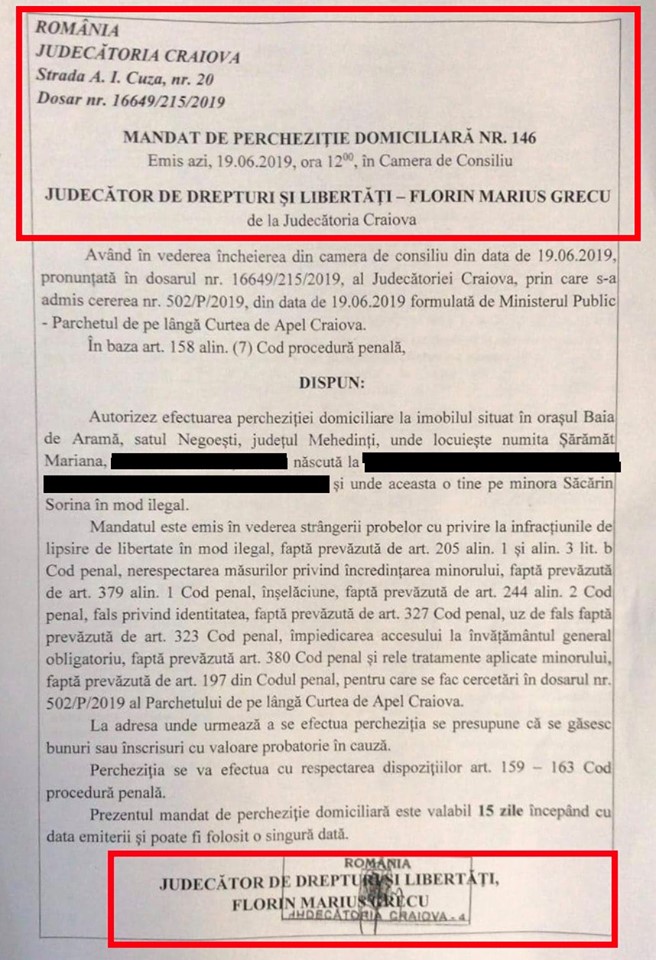 Mandatul a fost emis de fostul coleg al procuroarei cu privire la infracţiunile de lipsire de libertate în mod ilegal, nerespectarea măsurilor de încredinţare a minorului, înşelăciune, fals privind identitatea, uz de fals, împiedicarea accesului la învăţământul general obligatoriu şi rele tratamente aplicate minorului, urmând a se face percheziţia la adresa unde stătea micuţa Sorina, presupunându-se că se găsesc “bunuri sau înscrisuri cu valoare probatorie în cauză”. După 2 zile, vineri, pe 21 iunie 2019, dimineaţa, fosta colegă a lui Florin Marius Grecu a efectuat percheziţia prin care a ridicat-o pe micuţa Sorina şi a târât-o pe asfalt.