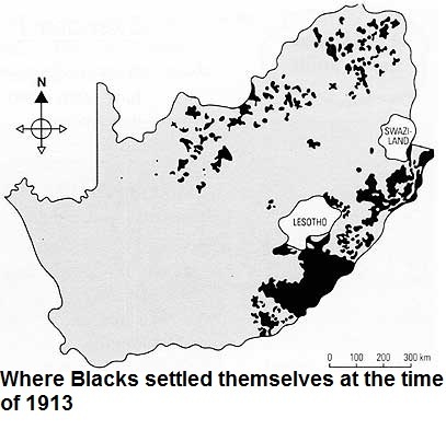 În 1913 albii au primit 85% din teritoriu. Mulți istorici se grăbesc să acuze albii de preluarea teritoriului populației negre ignorând multe aspecte, cum ar fi faptul că cea mai mare mină de platină a fost dată populației Tswana.