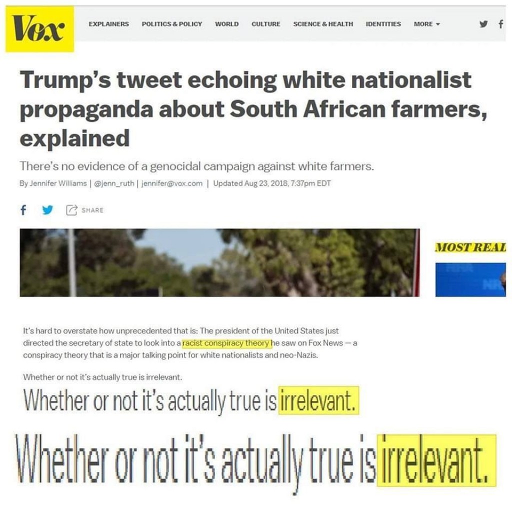 Vox merge și mai departe și ne spune că este irelevant dacă crimele se petrec sau nu, important este naționalismul alb, iar tweetul lui Trump nu face altceva decât să rezoneze cu naționalismul alb.