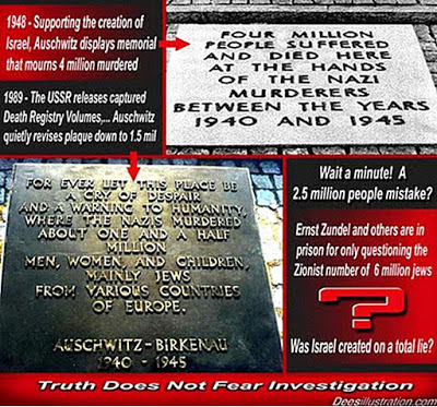 De exemplu, lagărul de la Auschwitz a existat, nimeni nu contestă existența lui. Deținuții de acolo nu erau uciși, dimpotrivă beneficiau de asistență medicală și de o serie de facilități incredibile: piscine, orchestre, echipe sportive, cinematograf, bordel, biserici, etc. În plus, așa numitele ”camere de gazare omicide” nu au existat și nu există (încă) decât în multe dintre penitenciarele americane. Americanul FRED LEUCHTER, de pe lista de mai sus, a clarificat multe din aspectele minciunii camerelor de gazare, iar cercetătorii viitorului trebuie să-și procure neapărat Raportul lui de Expertiză a camerelor mincinoase de gazare din actualul Auschwitz, raport și expertiză confirmată de Universitatea din Cracovia, de cercetătorul Germar Rudolf și mulți alții.
