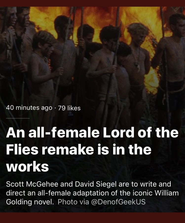 Sunt curioasă ce o să facă la box-office această capodoperă în devenire… Împăratul muștelor cu protagoniști exclusiv de sex feminin. Oare cum o să decurgă acțiunea? Vor sta la plajă toată ziua, vor bârfii, vor plânge că nu au bărbați care să le aducă mâncare, își vor regla menstruatiile, vor plănui cum să deturneze patriarhia… și vor aștepta ca bărbații să vină să le salveze?