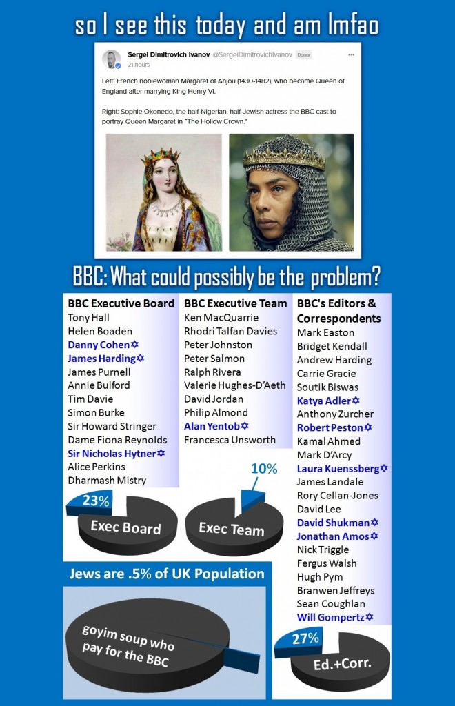 Oare de ce face (((BBC))) toate astea? Nu uitati ca britanicii sunt obligati prin lege sa plateasca o licenta pentru BBC, fie ca au televizor sau nu.