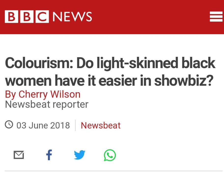 BBC se întreabă dacă nu cumva negresele cu pielea mai deschisă la culoare o duc mai bine în industria divertismentului.. desigur este o trimitere clară la faptul că femeile albe reușesc mult mai ușor.. pentru că au, desigur, privilegiu alb.