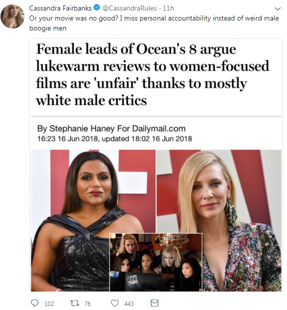 Eșecul filmului Ocean’s 8, o continuare a filmului Ocean’s 11, dar care a avut ca protagoniști numai femei a fost un eșec total și, desigur, bărbatul alb este vinovat! De ce? Pentru că majoritatea criticilor de film sunt bărbați albi..