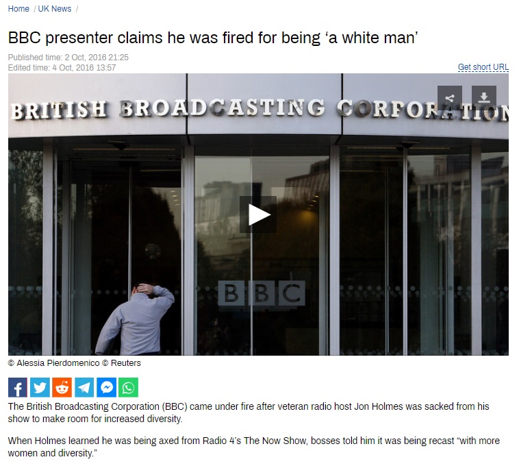 Dar tot BBC dă afară un angajat pentru că este bărbat alb și nu aduce diversitate.