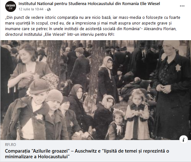 Alexandru Florian, președintele institutului terorist Elie Wiesel, publică un interviu în RFI în care spune că asocierea atrocitătilor din azilele de bătrâni cu holocaustul constituie o minimizare a holocaustului. Conform legii staliniste OUG 31/2002, acest lucru constituie o infracțiune.