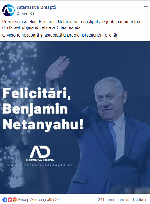 Alternativa Dreaptă Felicită pe Benjamin NEtanyahu
