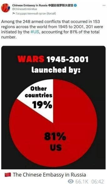 Ambasada Chinei: Din 248 de conflicte armate care au avut loc în 153 regiuni de pe glob (1945-2001), 201 au fost inițiate de S.U.A., însumând 81% din total.