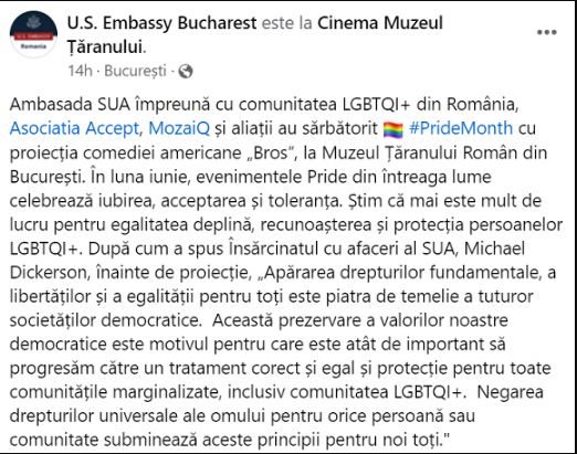 „Ambasada SUA împreună cu comunitatea LGBTQI+ din România, Asociatia Accept, MozaiQ și aliații au sărbătorit Pride Month cu proiecția comediei americane „Bros”, la Muzeul Țăranului Român din București.