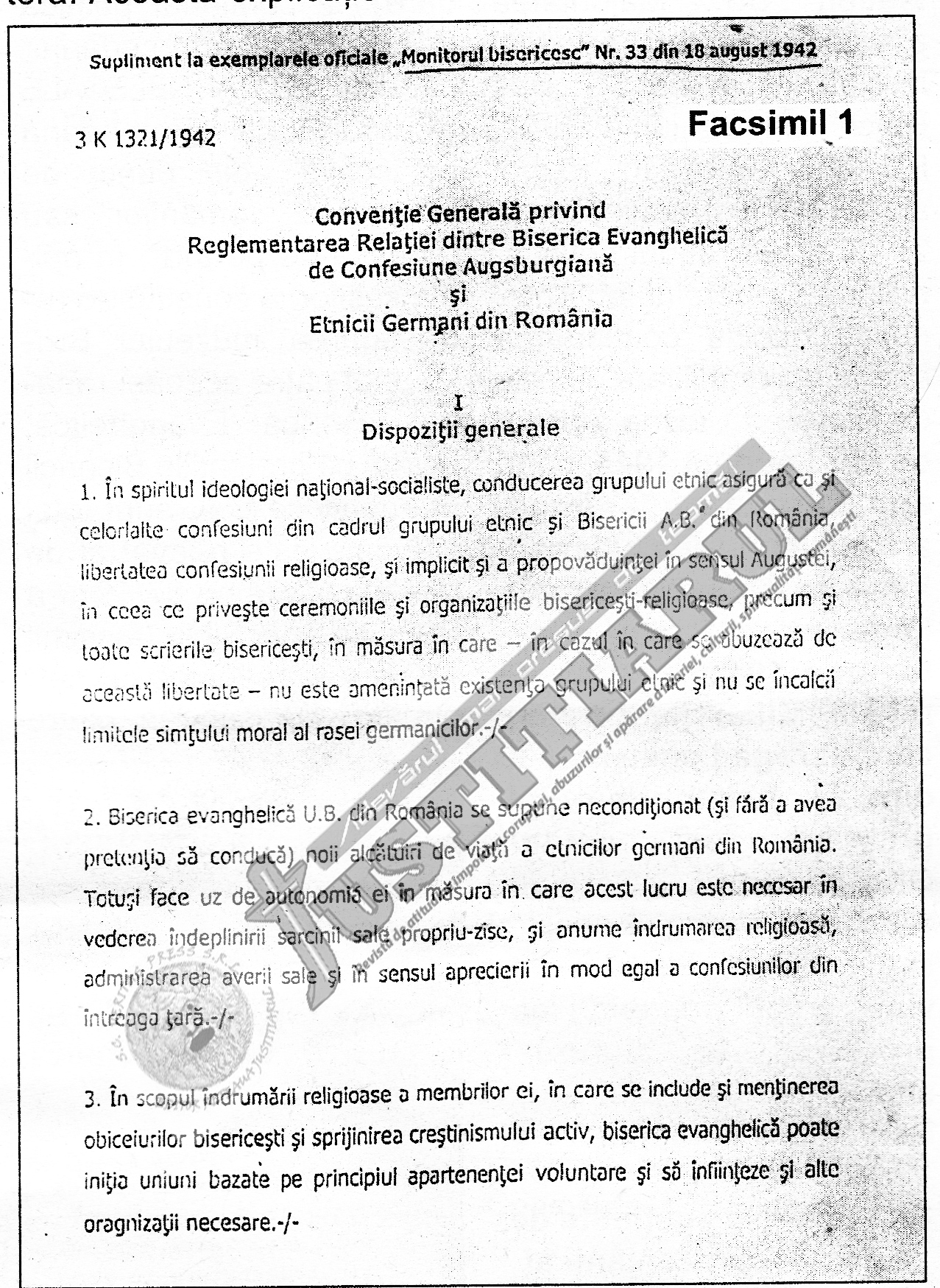 Nu s-a preluat nimic discreționar de către Grupul Etnic German de la Biserica Evanghelică, prin forță, cum încearcă să acrediteze ideea liderii FDGR-ului și ai bisericii evanghelice săsești, ca dovadă: Convenţia Generală din 11 august 1942 privind Reglementarea Relaţiei dintre Biserica Evanghelică de Confesiune Augsburgiană şi Etnicii Germani din România, pe care o prezentăm în facsimilele de mai jos. (Click pe documente pentru mărire!)