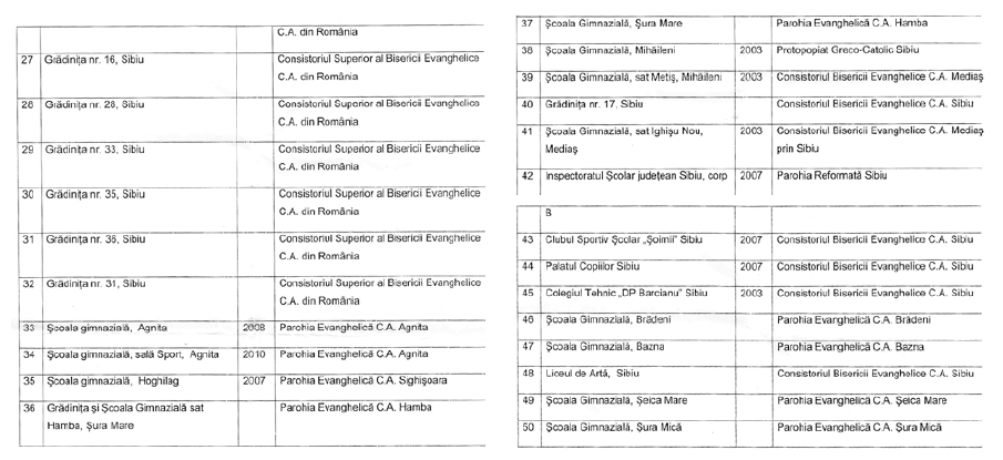 Ca să vă dați seama de amploarea retrocedărilor unor imobile care adăpostesc unități de învățământ către Biserica Evanghelică C.A., unde statul român plătește acum etnicilor germani chirie pentru educația copiilor, cu mențiune că unele dintre aceste clădiri au fost construite pe vremea comuniștilor și nu au avut cum să aparțină bisericii sașilor, dar aceștia revendică terenul pe care se află respectivele imobile, iată o listă cu retrocedările școlilor și grădinițelor din județul Sibiu, fără numărul copleșitor de licee revendicate și deja retrocedate!!! (Click pe documente pentru mărire!)