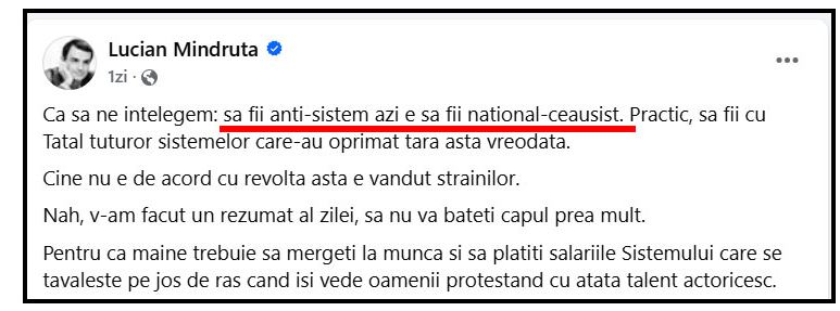 “Ca sa ne intelegem: sa fii anti-sistem azi e sa fii national-ceausist. Practic, sa fii cu Tatal tuturor sistemelor care-au oprimat tara asta vreodata. Cine nu e de acord cu revolta asta e vandut strainilor. Nah, v-am facut un rezumat al zilei, sa nu va bateti capul prea mult. Pentru ca maine trebuie sa mergeti la munca si sa platiti salariile Sistemului care se tavaleste pe jos de ras cand isi vede oamenii protestand cu atata talent actoricesc.”, a scris pe facebook Lucian Mîndruță