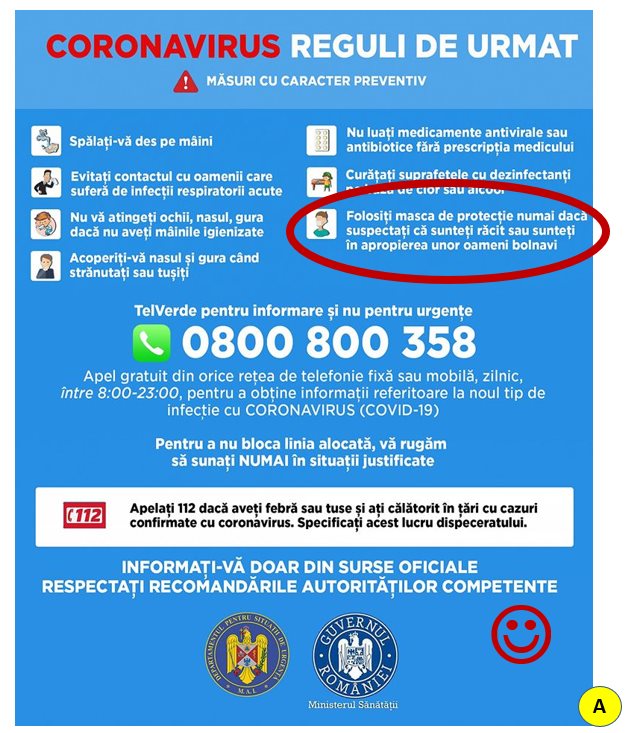 1 martie. Începe să fie difuzat intens, la televiziuni și pe platformele sociale, infograficul Grupului de Comunicare Strategică, care recomandă: „Folosiți masca de protecție numai dacă suspectați că sunteți răcit sau sunteți în apropierea unor oameni bolnavi”. Două luni și jumătate mai târziu, portul măștii în spații publice închise devine obligatoriu prin lege [v. imagine atașată A].