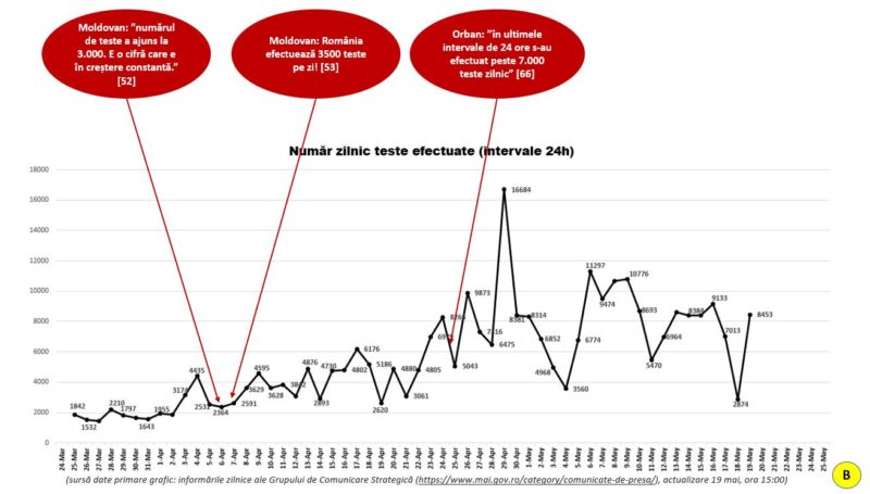 Fals. Număr zilnic de teste (pe 24 ore) efectuate în România în cele șapte zile premergătoare declarației (inclusiv), conform informărilor zilnice ale GCS: 5186; 2620; 4880; 3061; 4805; 6979; 8266. Număr zilnic mediu de teste efectuate de la data primului caz pozitiv și până pe 17 mai: 3933,5 (GCS) [67] (v. și imaginea atașată B).