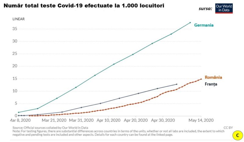 Fact check. În realitate, conform datelor GCS, numărul zilnic mediu de teste efectuat în România în perioada 1-7 aprilie a cifrat doar 2.700. Comparativ, Germania efectuase în perioada 29 martie – 5 aprilie cca. 58.265 teste zilnic, iar Franța, în perioada 31 martie – 7 aprilie cca. 15.570 (OurWorldInData / ECDCP, v. și imagine atașată C).