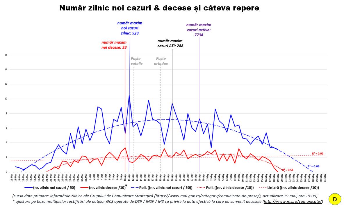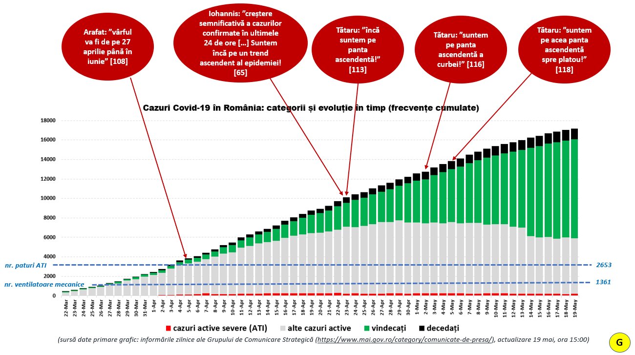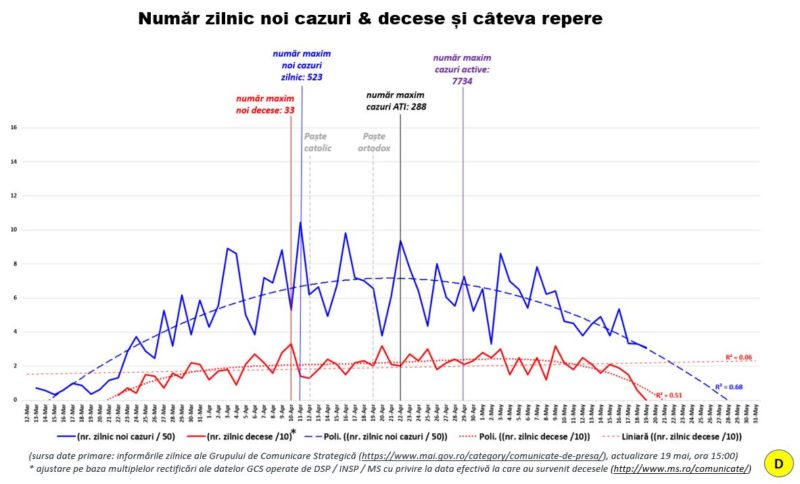 Fact check: până la data de 19 mai, conform datelor oficiale comunicate de autoritățile române: numărul zilnic maxim de decese s-a înregistrat (în mod real) pe 10 aprilie (33), cu un al doilea vârf, mai degrabă ca oscilație de moment, pe 9 mai (32); numărul maxim de cazuri active s-a înregistrat pe 29 aprilie (7734, în realitate probabil chiar mai timpuriu); numărul maxim de cazuri grave internate în secții ATI a fost atins pe 22 aprilie (288); numărul zilnic maxim de noi cazuri s-a înregistrat pe 11 aprilie (523) (vezi și imaginile atașate D, G și H).