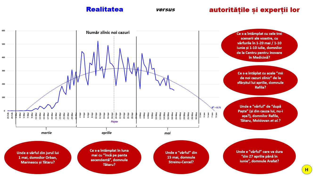 – 15 aprilie. Horațiu Moldovan: „ne așteptăm să se producă un nou val de cazuri de coronavirus după aceste Sărbători Pascale. Noi sperăm să fim în limita unei dublări. Dacă acest salt va fi peste dublu, sistemul medical poate să ajungă la limita lui de funcționare și să trebuiască să luăm măsuri speciale” (Antena 3) [111]. Fact check: nici pomeneală de salt, darămite dublu; valoarea maximă a numărului zilnic de noi cazuri s-a înregistrat cu 8 zile ÎNAINTEA Paștelui, sărbătoarea neinfluențând cu nimic tendința susținut descrescătoare;