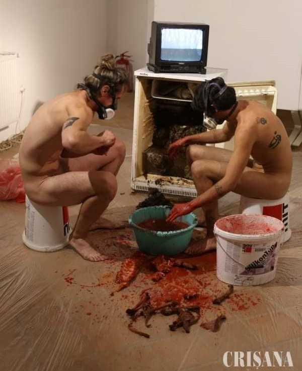 În spatele panourilor se văd doar gleznele şi tălpile goale ale celor doi tineri. Se învârt pe loc, freamătă, apoi îşi fac apariţia din spatele panourilor… în cucul gol! Câteva doamne mai să-şi scape paharele din mâini, o mămică îşi trage repede fetiţa afară din încăpere. Totuşi, la timp, greul abia acum începe. Cei doi tineri poartă pe faţă o mască din cele folosite de vopsitorii auto, cu filtre nazale imense. Agale, în curul gol, traversează încăperea printre spectatori şi ies afară, în curtea din spate, de unde aduc în braţe un frigider mic, din soiul celor folosite în hoteluri. În urma lor se degajă un miros de hoit insuportabil, care îmbâcseşte încăperea în câteva secunde. Unul dintre tineri se aşază pe o găleată întoarsă cu fundul în sus şi începe să toarne cu palmele făcute căuş, vopseaua roşie ca sângele într-un lighean. Celălalt, aşază televizorul pe frigiderul împuţit şi scoate apoi bucăţi de carne sângerânde dintr-un sac, le freacă tacticos cu o perie de sârmă, le aruncă în lighean. Deschide frigiderul larg, unde zac bucăţi de carne, negre, în putrefacţie. Duhoarea de cadavru alungă rapid mulţi spectatori. Cei doi încep să desfacă carnea putrezită de pe oase şi o depun în lighean, oasele le aruncă grămadă, în faţa lor. La un moment dat, unul dintre tineri începe să urineze în lighean, apoi se năclăiesc din cap până în picoare unul pe celălalt cu chestia din găleată!