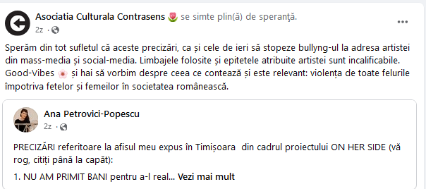 Asociația Culturală Contrasens, cea care a organizat această expoziție cu numele „On Her Side/De partea ei” s-a scuzat într-o postare pe Facebook menționând faptul că expoziția „are o miză socială şi dezbate subiectul violenţei de gen şi a ciclului de abuz asupra femeilor”.