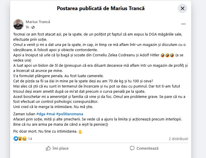 Tocmai ce am fost atacat azi, pe la spate, de un polițist pt faptul că am expus la DGA măgăriile sale, efectuate prin soție.