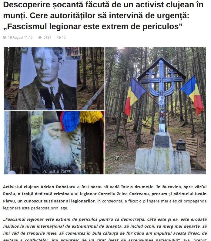Satanele au vandalizat portretul Căpitanului de la troița de pe Muntele Rarău. Fapta a fost consecința unui articol comandat de activistul neocomunist clujean Andrei Dohotaru.