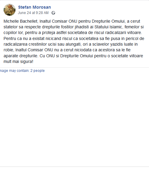 Michelle Bachellet, Inaltul Comisar ONU pentru Drepturile Omului, a cerut statelor sa respecte drepturile fostilor jihadisti ai Statului Islamic, femeilor si copiilor lor, pentru a proteja astfel societatea de riscul radicalizarii viitoare. Pentru ca nu a existat nicicand riscul ca societatea sa fie pusa in pericol de radicalizarea crestinilor ucisi sau alungati, ori a sclavelor yazidis luate in robie, Inaltul Comisar ONU nu a cerut niciodata ca acestora sa le fie aparate drepturile. Cu ONU si Drepturile Omului pentru o societate viitoare mult mai sigura!