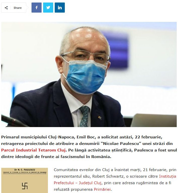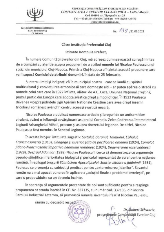 Odată ce s-a aflat în presă au început presiunile, domnul Robert Schwartz, președintele Comunității Evreilor Cluj, a trimis o scrisoare către prefectură prin care atrage atenția asupra literaturii antisemite produsă de marele Paulescu, cerând ca strada să nu fie denumită după el. Nu a trecut o zi întreagă și Emil Boc, primarul Clujului, retrage proiectul de pe ordinea de zi.