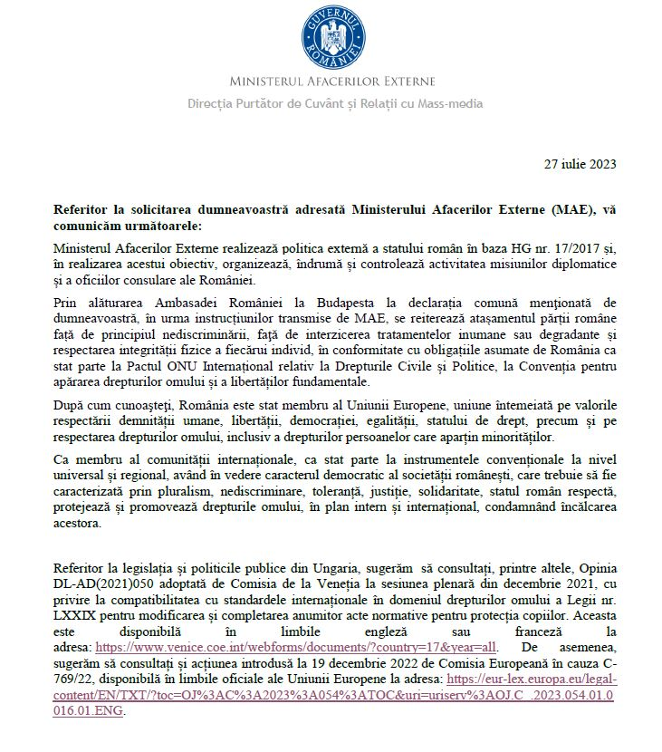 Ministerul Afacerilor Externe a confirmat, într-un răspuns pentru R3media, că Ambasada României de la Budapesta a primit „instrucțiuni” de la București, astfel încât să se alăture demersului Ambasadei SUA de a condamna Ungaria pentru „legile și retorica politică, venită în contradicție cu principiile non-discriminării, legilor internaționale privind drepturile omului” și care „contribuie la stigmatizarea comunității LGBTQI+”.