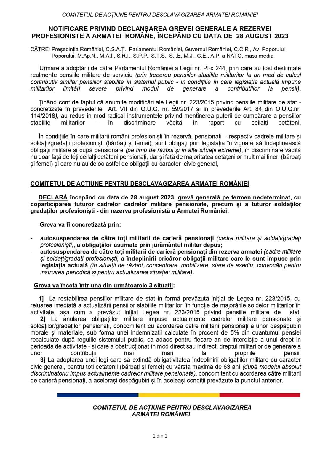 Într-un act fără precedent în istoria Armatei României, Comitetul de Acțiune pentru Desclavagizarea Armatei României a emis o notificare oficială, prin care anunță declanșarea unei greve generale a rezervei profesioniste a armatei, ce va începe la data de 28 august 2023. Prin intermediul acestei mișcări neașteptate, comitetul își propune să tragă un semnal de alarmă cu privire la problemele și provocările semnificative cu care se confruntă instituția militară.
