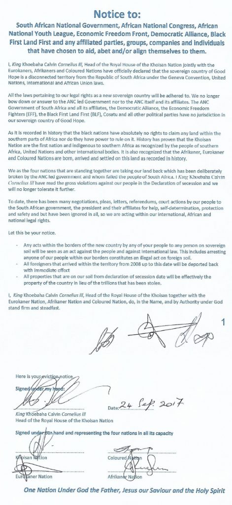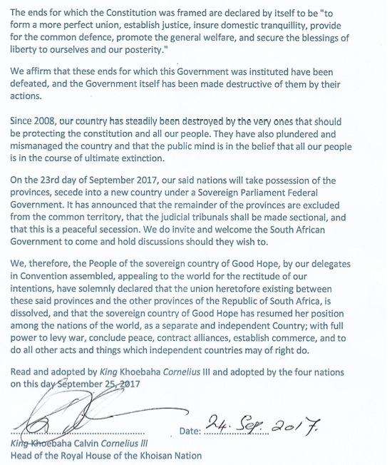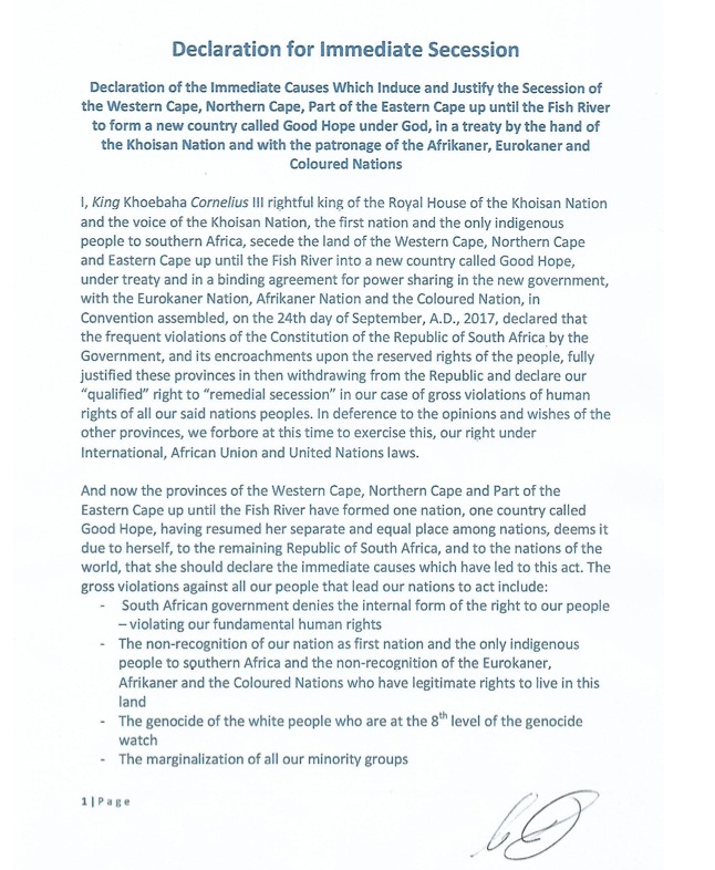 In Declarația de Secesiune Imediată, Buna Nădejde este o “nouă țara subt Dumnezeu, prin tratat al națiunii Khoisane și cu patronajul Afrikanerilor, Eurokanerilor si al Națiunilor Colorate.”