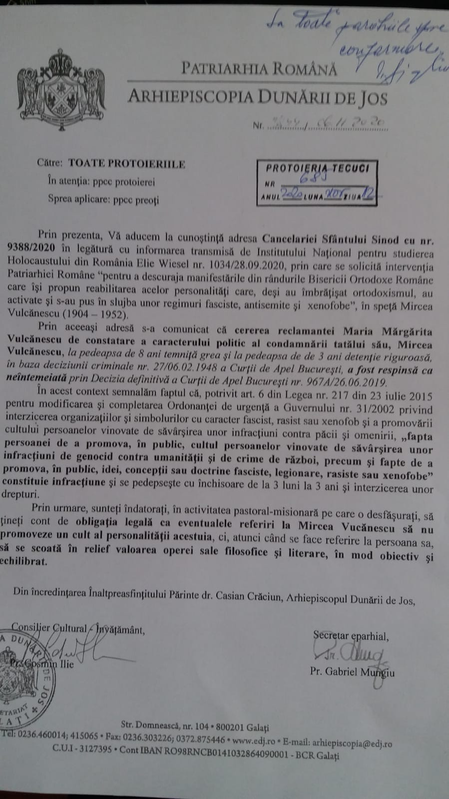 Lucrul regretabil este faptul că Patriarhia Română a cedat presiunilor, s-a lăsat intimidată sau a dat mâna cu asupritorii noștri, cerând episcopiilor să interzică promovarea unor personalități românești precum Mircea Vulcănescu.