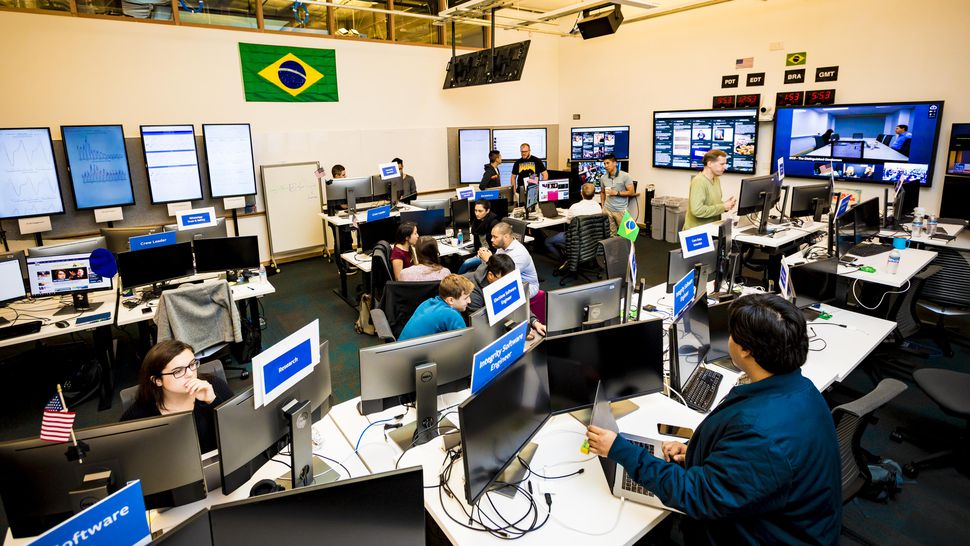 Un individ extrem de soios care vorbește ca Lucian Dunăreanu ne prezintă o încăpere denumită “Camera de Război” din clădirea Facebook.