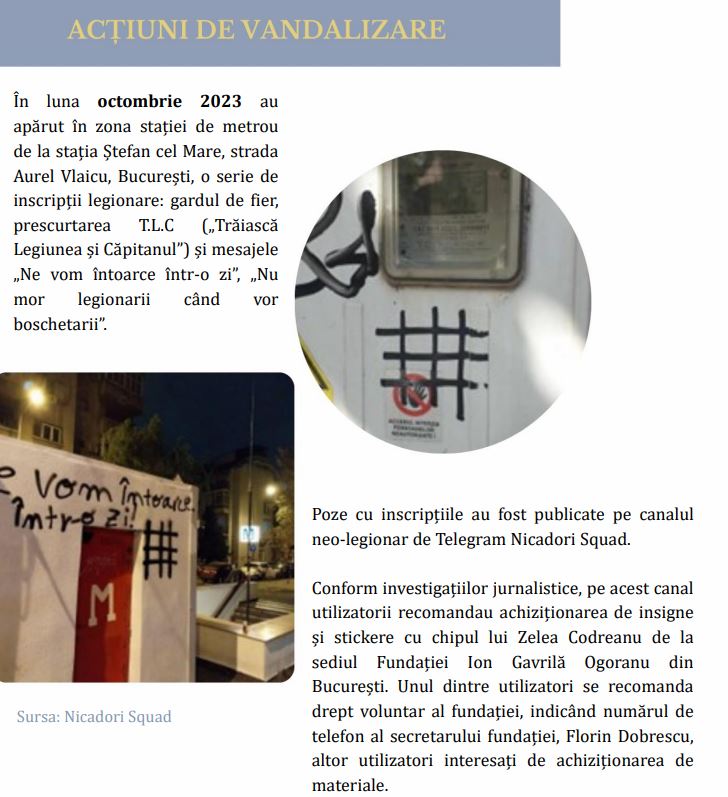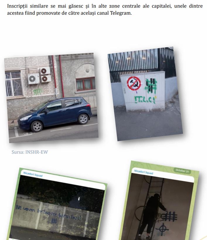 Este menționat canalul de Telegram Nicadori Squad, care a fost luat în vizor și de Adina Marincea. Alăturând textul despre canal cu imaginile inscripțiilor de pe ziduri se face subtil o legătură care nu există în realitate. De asemenea tovarășii acuză fundația Ion Gavrilă Ogoranu că ar avea o legătură cu Nicadori Squad. Nicadori Squad a mai publicat poze cu inscripții pe care le-au descoperit în capitală.